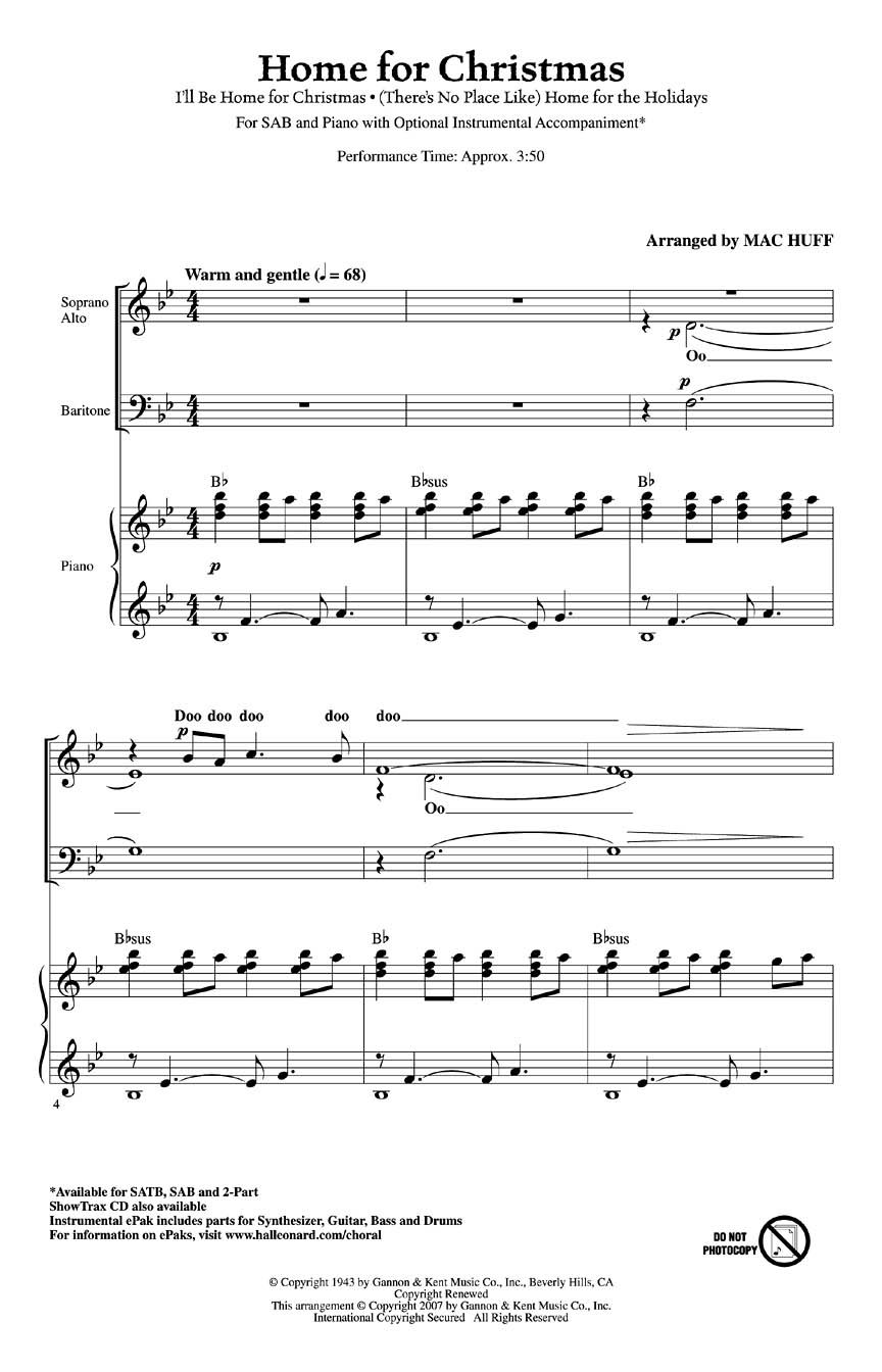 Your listeners will all be in the Christmas spirit with this selection that combines two holiday favorites: (There's No Place Like) Home For The Holidays, I'll Be Home For Christmas. Performance Time: Approx. 3:50. Available for SATB, SAB, 2-Part, ShowTrax CD and Instrumental ePak (parts for Synthesizer, Guitar, Bass and Drums).
