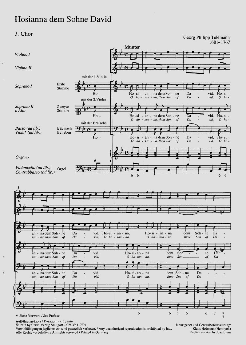 Kantate zum 1. Advent - 'Hosianna dem Sohne David' eröffnet als Kantate zum 1. Advent Telemanns Kantatenjahrgang 'Musicalisches Lob Gottes in der Gemeine des Herrn'. Dem Jahrgang liegen Dichtungen des Hamburger Jacobi-Hauptpastors Erdmann Neumeister zugrunde.
