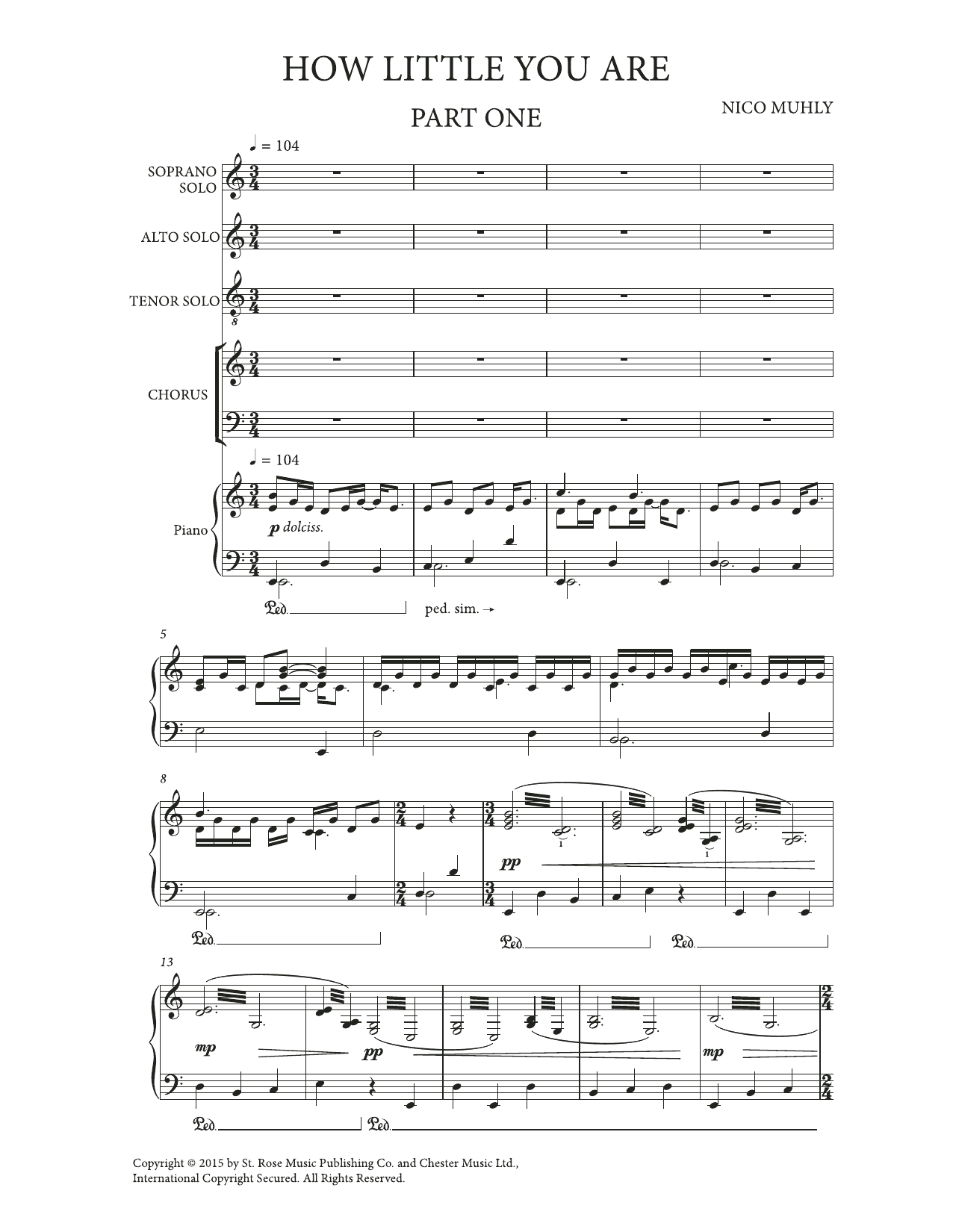 Nico Muhly's How Little You Are was composed in 2015 and is arranged for SATB divisi chorus and three Guitar quartets. Based on Cowboy Poetry texts, the work masterfully weds guitar and vocal textures, resulting in poignant Western impressions. Duration: approximately 40 minutes