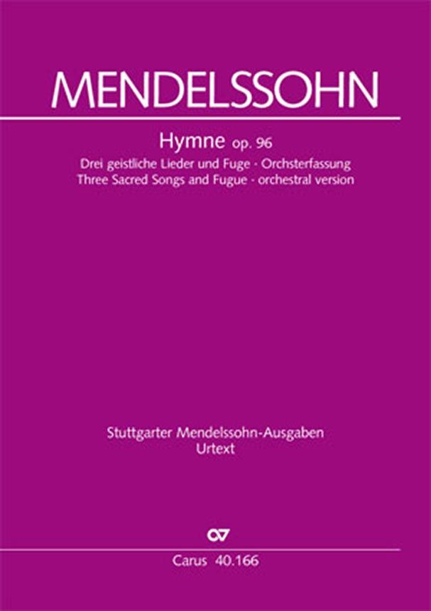 Den Ton der englischen Anthems wollte Mendelssohn mit seinen 1840 für England komponierten 'Drei geistlichen Liedern' op. 96 für Altsolo, Chor und Orgel treffen. Drei Jahre später passte er dem Werk noch ein - wie er sagte - 'Orchesterkleid' an und ergänzte eine Fuge. Coro SATB, Solo A, Org; (jeweils mit alternativer Besetzung).