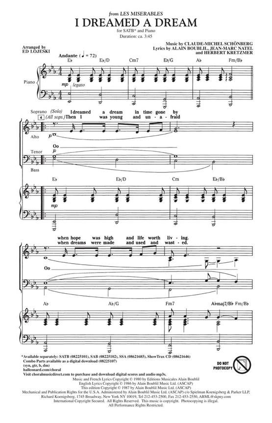 Fantine's famous song of broken dreams from the hit musical Les Misérables in a powerful and dramatic choral setting.
