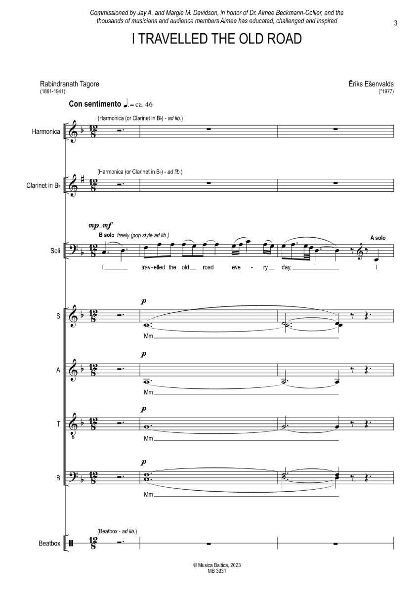 Neues Werk von Eriks Esenvalds, mit vier SATB- Chorsolisten, 7stimmigen gemischten Chor, einem Cajon-Spieler und wahlweise Klarinette in B oder Akkordeon.
