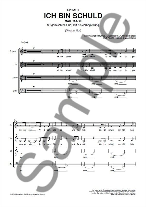 Die Gesangspartitur zu Max Raabes 'Ich bin Schuld', einem wunderbaren Werk arrangiert für SATB-Chor. Der Klavierpart ist separat erhältlich.