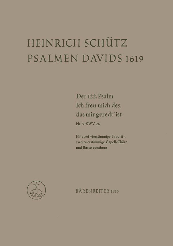 Psalm 122 aus Psalmen Davids für 2 Favoritchöre, 2 Capellchöre und Basso continuo. Urtext der Neuen Schütz-Ausgabe. Gemischter Chor (2) -SATB+SATB., Basso continuo