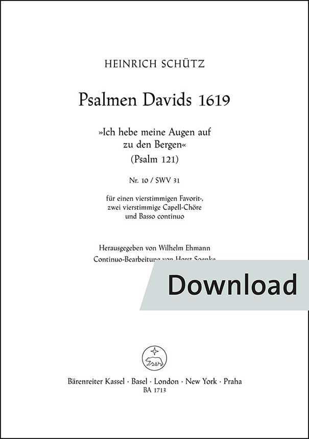Psalm 121 aus Psalmen Davids für Favoritchor (auch Soli aus dem Chor), 2 Chöre und Basso continuo. Urtext der Neuen Schütz-Ausgabe. Sopran solo, Alt solo, Tenor solo, Bass solo, Gemischter Chor (2)-SATB+SATB, Basso continuo