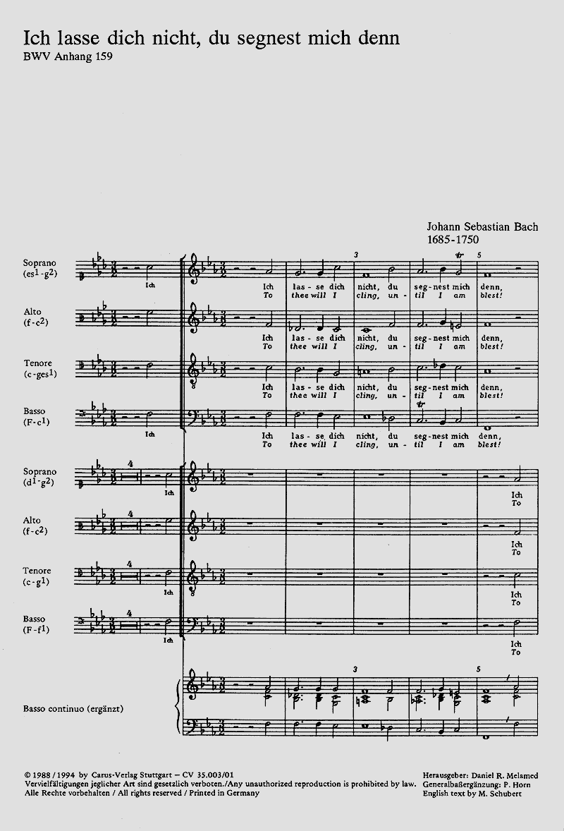 lange Zeit fälschlicherweise Johann Christoph Bach (später auch Johann Christian Bach) zugeschrieben; Entstehungszeit 1712/13 oder früher - Coro SATB/SATB, [Bc]