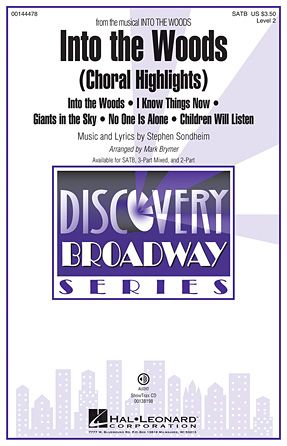 Into the Woods is now available for all levels with this Discovery choral arrangement! Your choirs will enjoy this accessible medley of Sondheim's most memorable songs from the award-winning musical, including Into the Woods, I Know Things Now, Giants in the Sky, No One Is Alone and Children Will Listen. Available separately: SATB, 3-Part Mixed, 2-Part, ShowTrax CD. Duration: ca. 7:50.