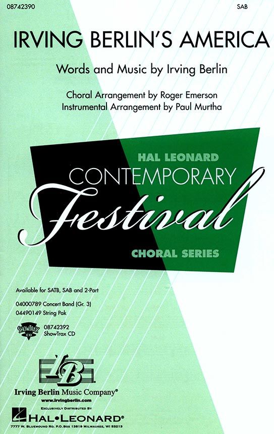 With a musical career spanning a century, the 20th century was Irving Berlin's own and his music was America's music. This spectacular choir, band and optional string medley of some of Irving Berlin's classic songs offers avariety of entertaining performance options. Includes: Alexander's Ragtime Band, There's No Business Like Show Business, Puttin' on the Ritz, Always, Blue Skies, God Bless America. Available: SATB, SAB, 2-Part, Concert Band (Gr.3), String Pak, ShowTrax CD. Performance Time: Approx. 7:00.
