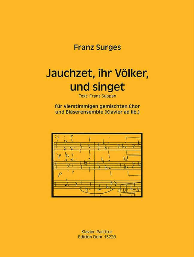 'Jauchzet, ihr Völker, und singet' auf einen Text von Franz Suppan entstand für den Kompositionswettbewerb 'Opus Styriale. (Zeit)Reise durch die Steiermark' und wurde prämiiert. Wegen der reduzierten Bläserbesetzung ist das Werk auch mit kleinen Chören realisierbar, kann im Sinne einer klassischen Orchestrierung aber auch problemlos bis zur 'sinfonischen Blasorchesterbesetzeung' erweitert werden. Ebenso wäre denkbar, das Werk lediglich mit einer Quintett-Besetzung (2 Flügelhörner, 2 Posaunen und Tuba) oder auch nur mit Klavierbegleitung aufzuführen. (Franz Surges)