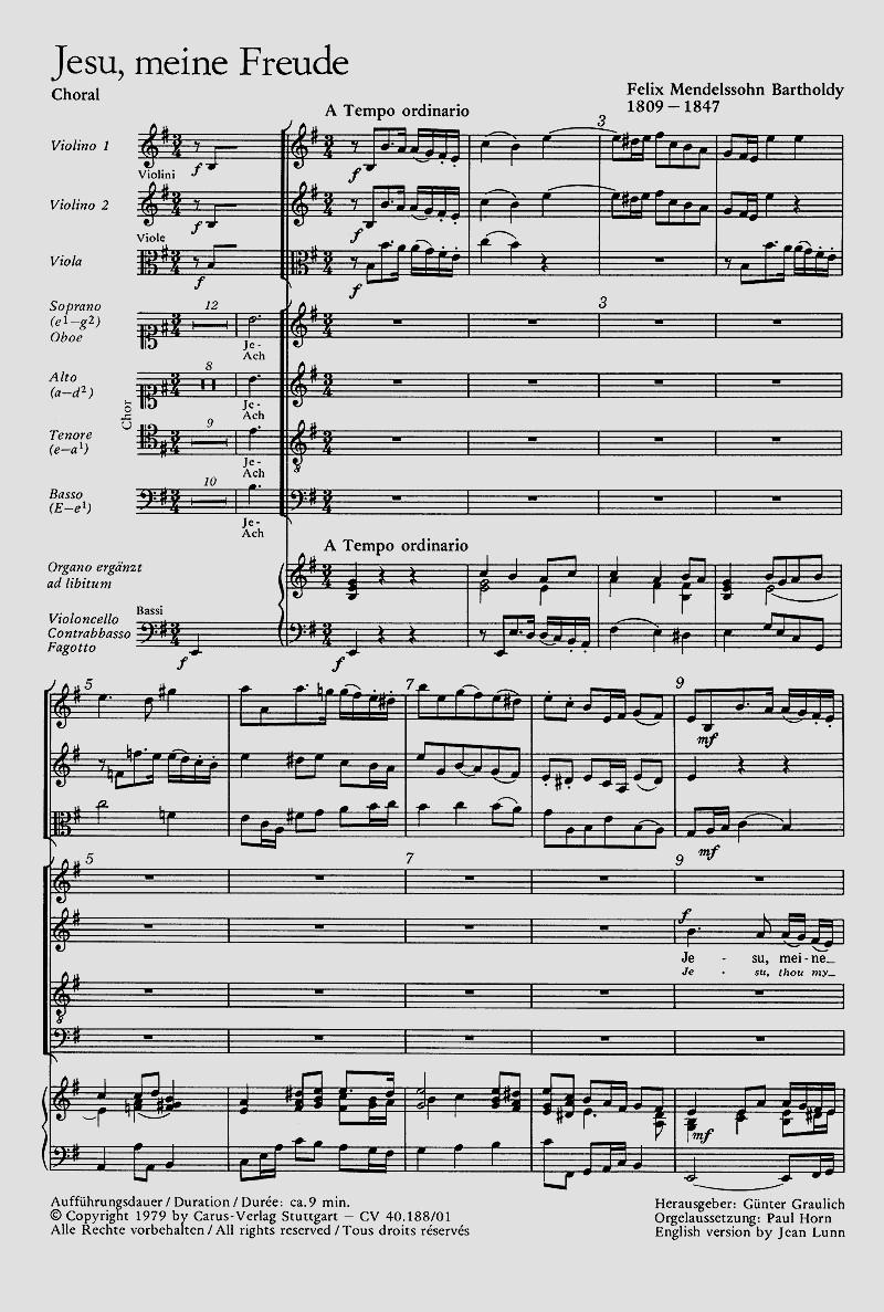Choralkantate - enthält auch Arrangement für Orgel Schon während Mendelssohns Lehrjahren bei Zelter hatte die Bearbeitung von Chorälen eine große Rolle gespielt, und die Beschäftigung mit dem evangelischen Choral zieht sich sogar durch sein sinfonisches und oratorisches Schaffen. Die im Zusammenhang mit der Wiederaufführung der Matthäuspassion besonders intensive Auseinandersetzung mit dem Werk Bachs führte zu einer Reihe von Kantaten über bekannte Cho-ralweisen für Chor, Instrumente und manchmal auch Soli. Nicht nur für Kantatengottesdienste stellen sie eine große Bereicherung dar. Coro SATB, 2 Vl, Va, Vc/Cb, [Ob/Fg] (arr: Org)