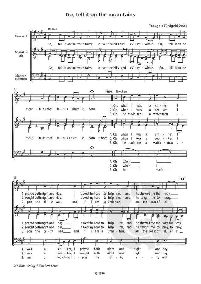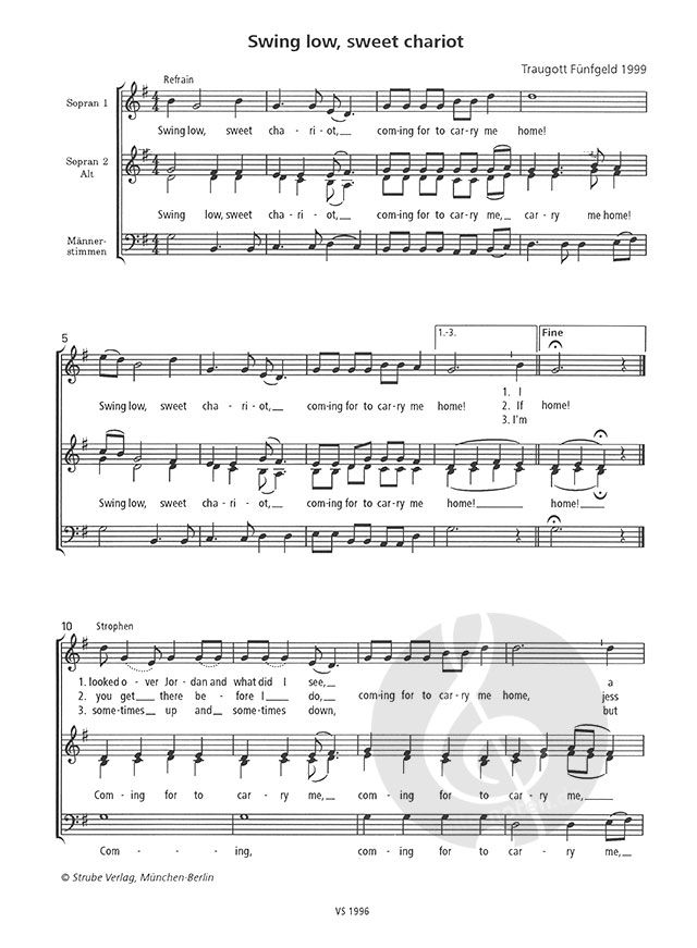 12 Spirituals für gemischten Chor a cappella. Bd. II: 6281, Bd. III: 6414, Bd. IV: 6522. - Die Spirituals sind so geschickt eingerichtet, dass sie von zwei bis drei Frauenstimmen und einer Männerstimme ausgeführt werden können. Der Schwierigkeitsgrad ist dabei nicht zu hoch angesetzt, dennoch klingen die einzelnen Sätze authentisch und das 'Swing-Feeling' kommt von ganz alleine.