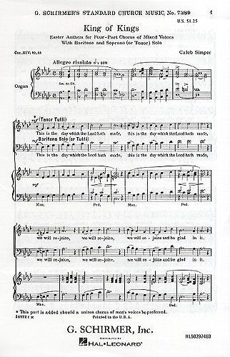 King Of Kings is a wonderfully spirited Easter anthem, composed by Caleb Simper, for four-part (SATB) chorus of mixed voices, with a baritone and soprano (or tenor) solo.