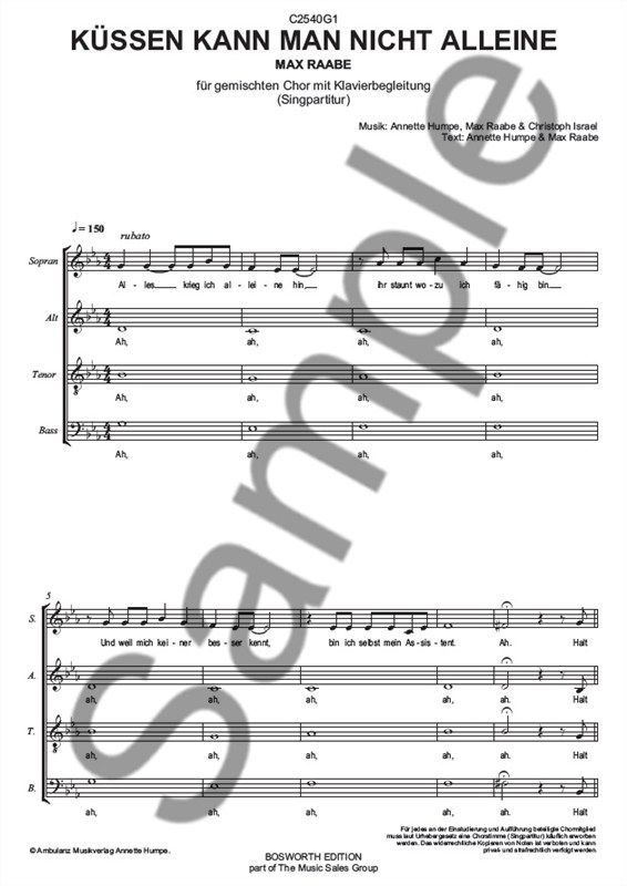 Der Titelsong 'Küssen kann man nicht alleine' aus Max Raabes gleichnamigem Album von 2011, arrangiert für gemischten Chor SATB mit Klavierbegleitung.