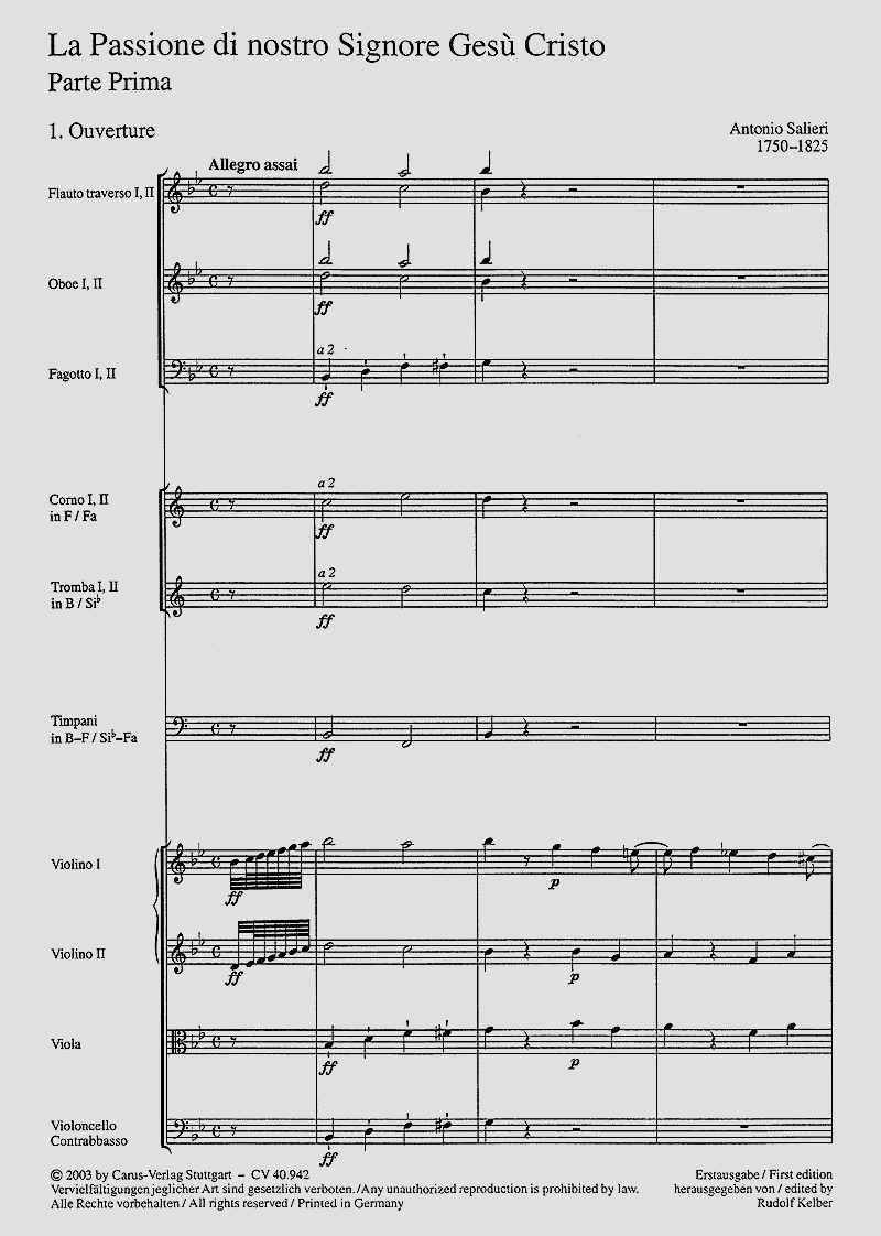 Pietro Metastasios Libretto zur 'azione sacra' 'La Passione di Gesù Cristo' (1730) ist ein Prototyp des italienischsprachigen katholischen Oratoriums im 18. Jahrhundert, bei dem der Wortlaut der Bibel vollständig in freie Poesie umgeformt ist. Ursprünglich für Antonio Caldara geschrieben, ist der Text viele Male in Musik gesetzt worden. Aber Salieris, der italienischen Opera seria nahestehende Vertonung sei, so der berühmte Dichter in einem Brief an den erst 26-jährigen Komponisten, 'die ausdrucksvollste Musik von allen, die auf dieses Gedicht geschrieben wurde.' Eine deutsche und englische Übersetzung des Librettos ist der Edition beigefügt worden. Soli SATB, Coro SATB , 2 Fl, 2 Ob, 2 Fg, 2 Cor, 2 Ctr,Timp, 2 Vl, Va, Bc