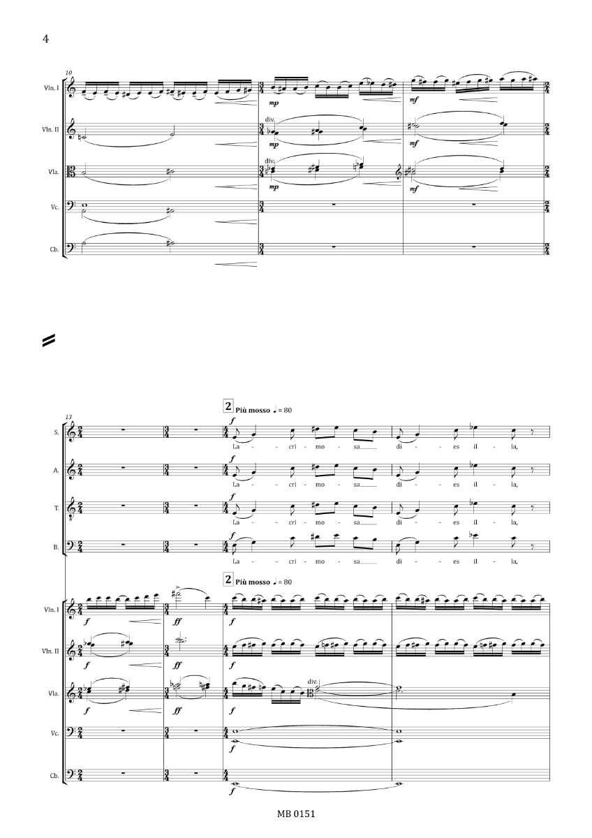 - Besetzung Gemischter Chor (SSAATTBB), Violine 1, Violine 2, Viola, Violoncello und Kontrabass