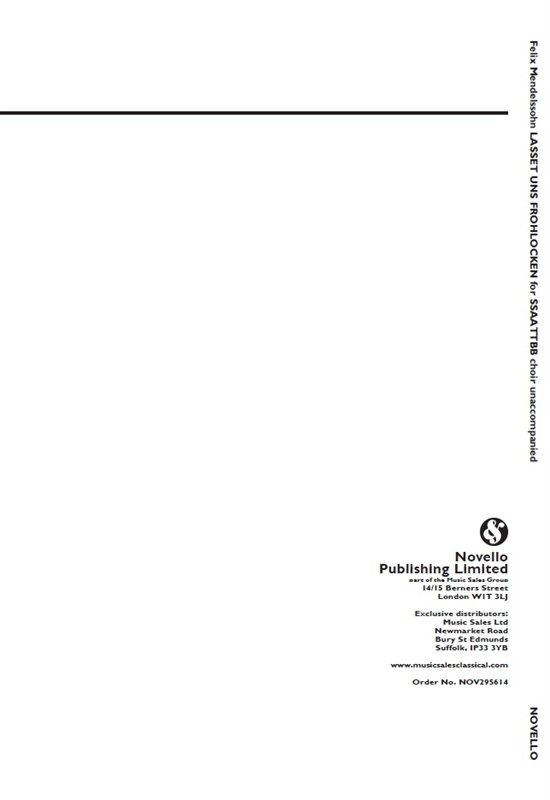 Lasset Uns Frohlocken is a work by Felix Mendelssohn for Unaccompanied SSAATTBB Choir. A performance of this piece lasts around 2 minutes, and please note that the lyrics are in German.