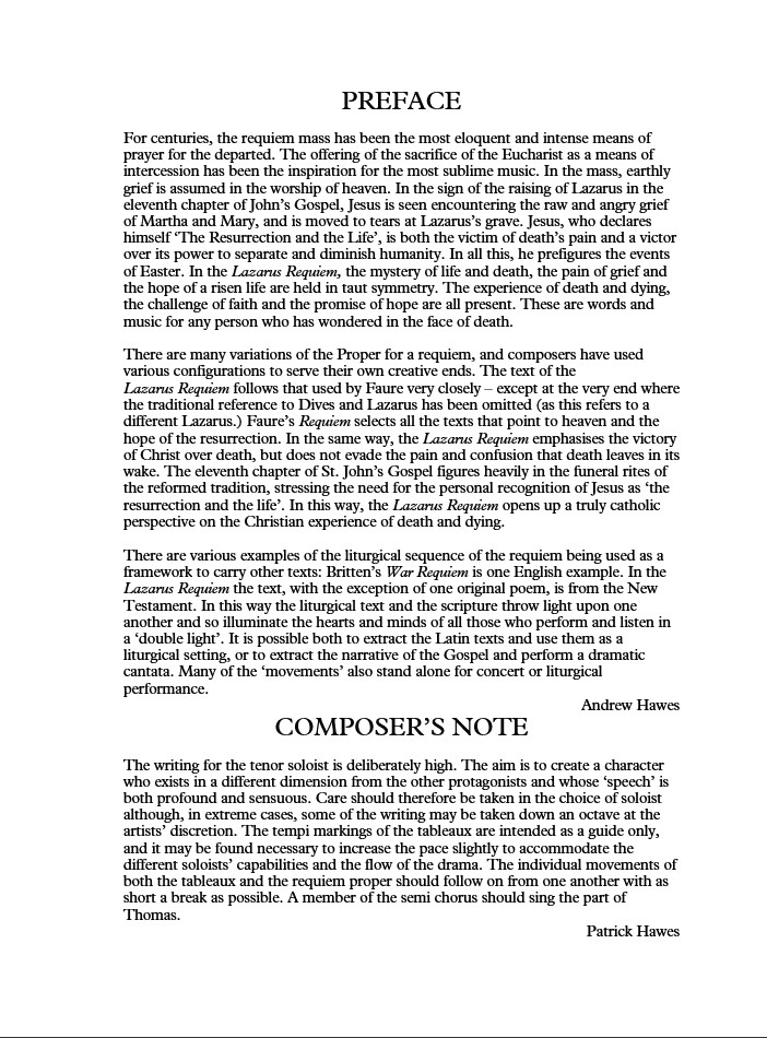 Written for two solo sopranos, tenor, baritone, SATB chorus and orchestra. Text by Andrew Hawes.