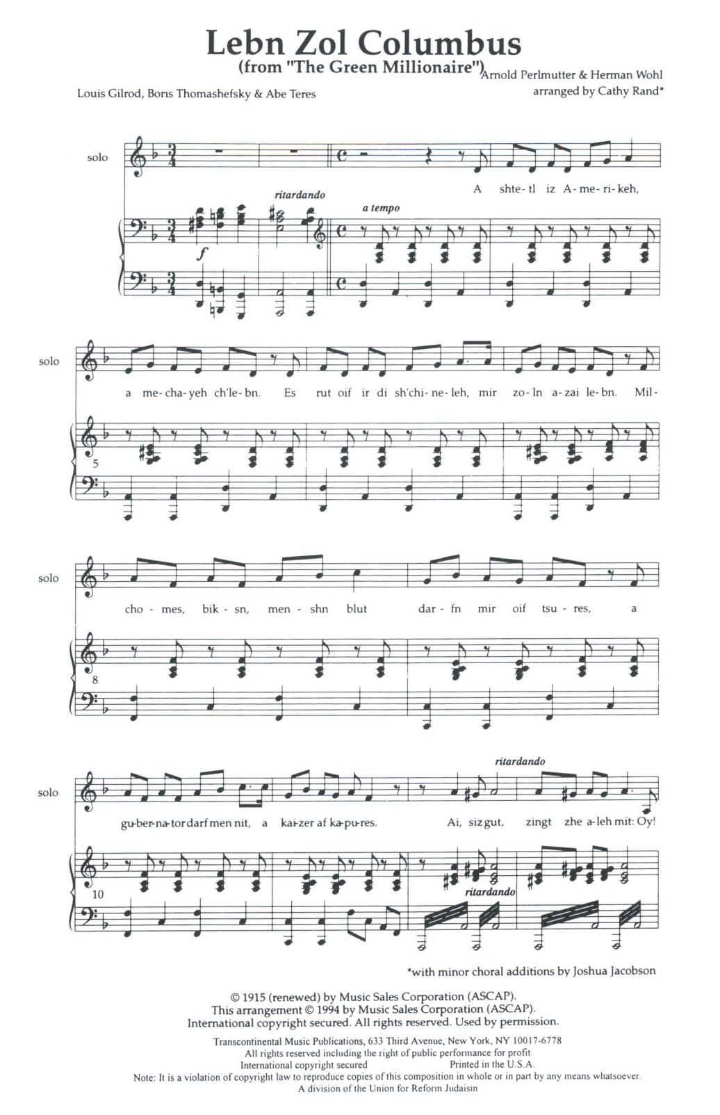 From 'The Green Millionaire'. Text by Louis Gilrod, Boris Thomashefsky, Abe Teres. This Yiddish theatre song praises Columbus for discovering the 'golden land' of America. Available for SATB, with solo and piano.