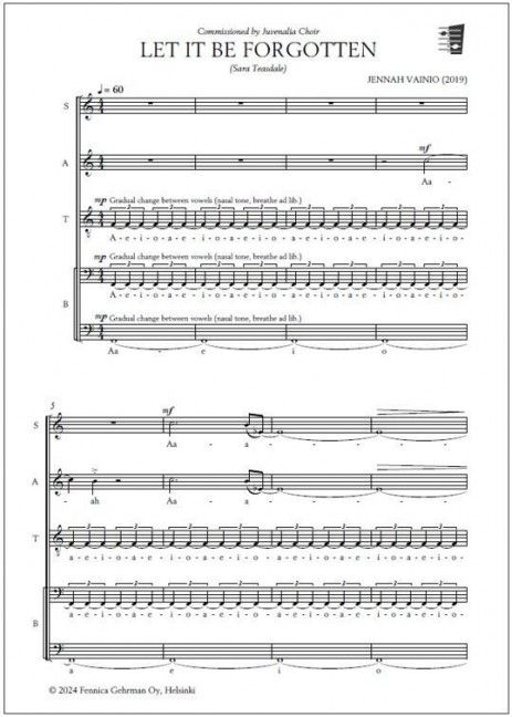Jennah Vainios Let it be forgotten (2019) zu einem Gedicht von Sara Teasdale (1884–1933) wurde vom Juvenalia Choir in Auftrag gegeben. "Wie das Leben selbst welkt die Liebe mit der Zeit. Wie Blumen und Feuer verblasst sie, aber die Erinnerung bleibt, und die Zeit friert sie. Mit der Zeit bekommt Traurigkeit einen goldenen Streifen. Die wunderschön leuchtenden Harmonien des Werks tragen zur Stimmung des Gedichts bei."