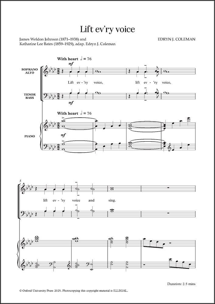 This inspiring piece sets the text 'Lift every voice and sing' by writer and civil rights activist James Weldon Johnson. The rising opening vocal figures develop in strength until a central section in which the loud, rolling sea is musically represented with a change to a propulsive compound metre.