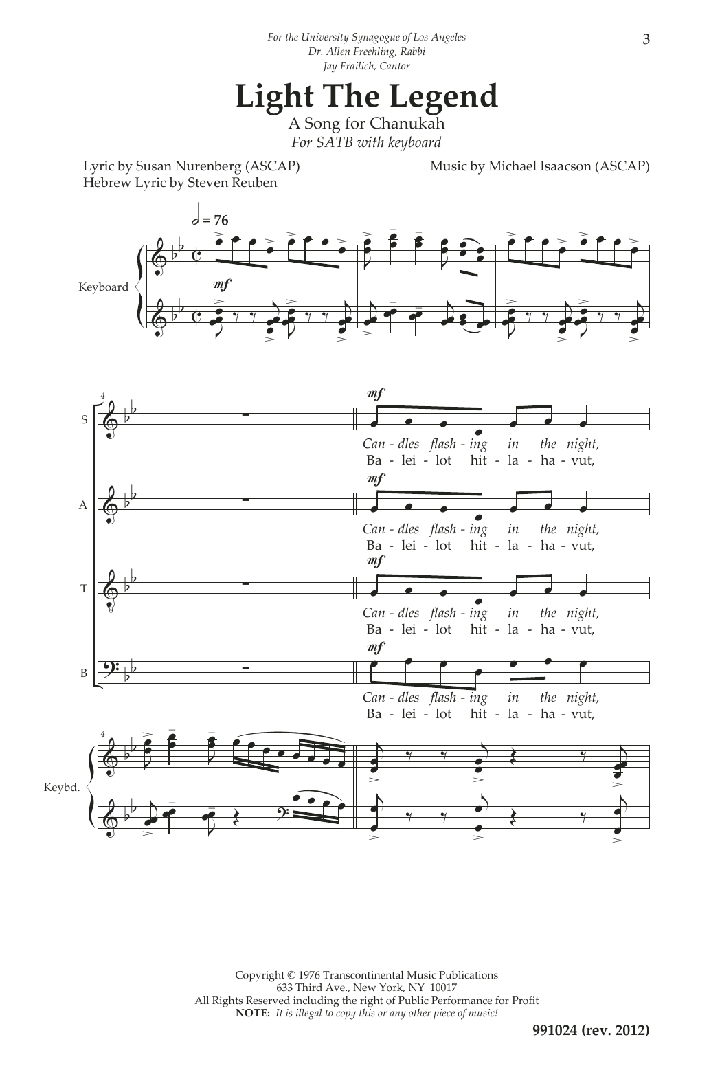 A Song for Chanukah'. Text by Susan Nuremberg. For SATB and piano.