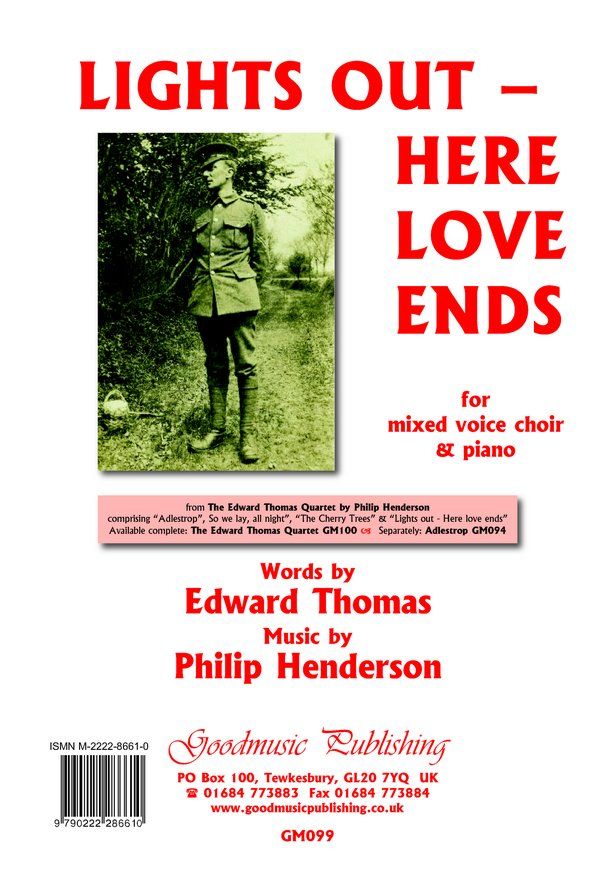 A new setting by Philip Henderson for mixed voice choir (SATB with divisi) and piano of words by Edward Thomas (1878-1917). Taken from 'The Edward Thomas Quartet', four settings comprising 'Adlestrop', 'So we lay, all night', 'The Cherry Trees' and 'Lights out - Here love ends'. The Quartet is available complete (GM100) and 'Adlestrop' is also published separately (GM094).