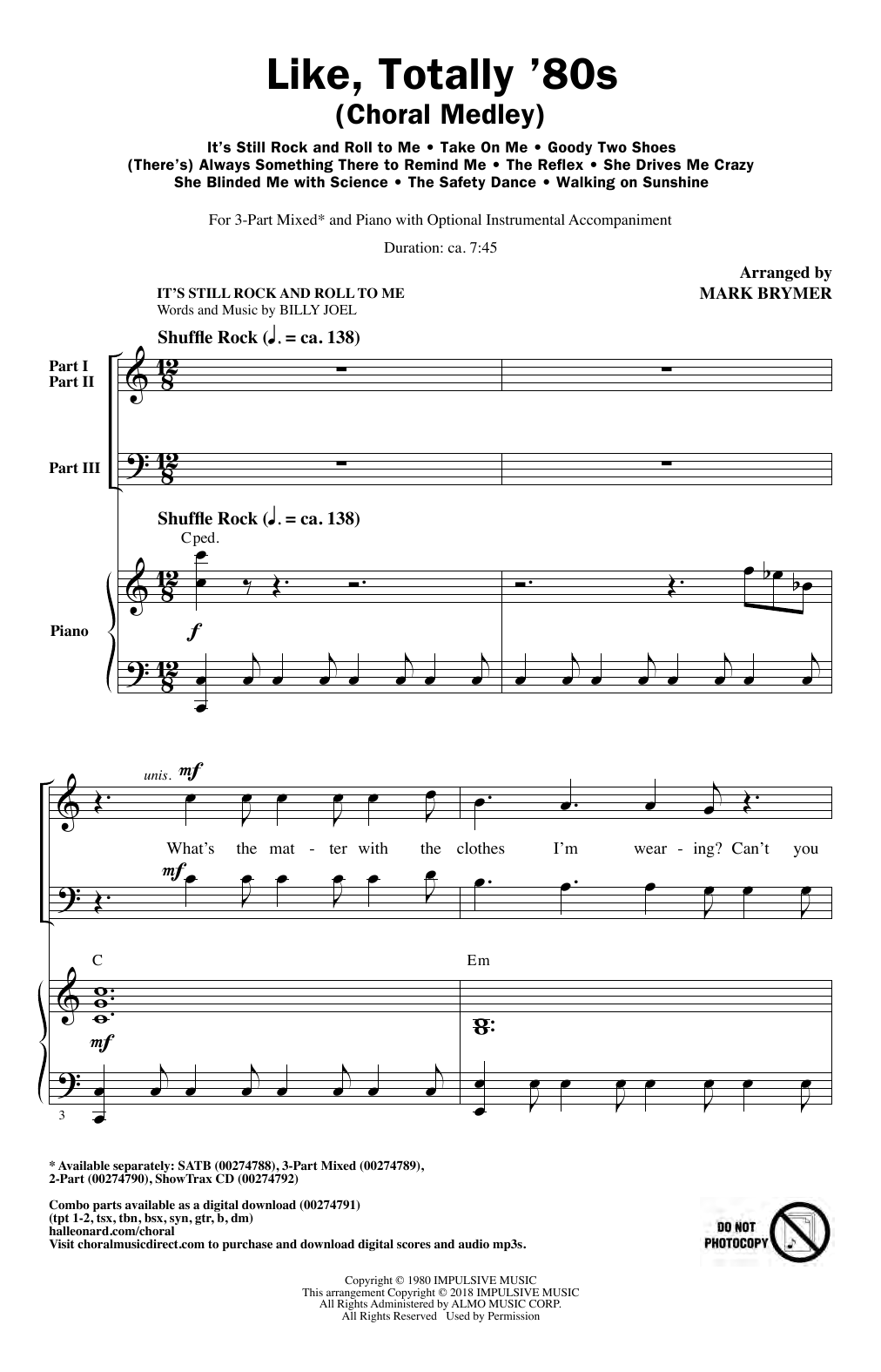 An absolutely stuffed 1980s choral medley with Top Ten hits, head-banging choruses and radical harmonies throughout? No way! Mark Brymer's nine-song throwback to the music of the Reagan years is, like, totally righteous, dude. Features It's Still Rock and Roll to Me, Take On Me, Goody Two Shoes, (There's) Always Something There to Remind Me, The Reflex, She Drives Me Crazy, She Blinded Me with Science, The Safety Dance and Walking on Sunshine.
