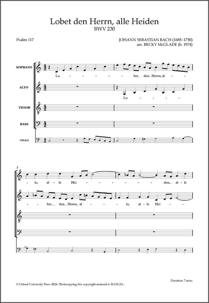 J. S. Bach's motet, Lobet den Herrn, alle Heiden, BWV 230, is presented here with the basso continuo transcribed for solo cello. Offprinted from Music for Choir and Cello.