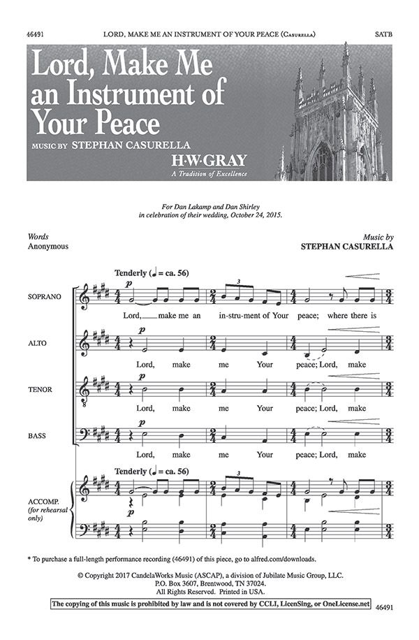 The immortal prayer of St. Francis has been set with rare a cappella beauty by Stephan Casurella, a fresh newcomer to the H. W. Gray catalog. The carefully-crafted contrapuntal vocal movements of the satisfying melody and harmony perfectly paint the text. Beautiful!
