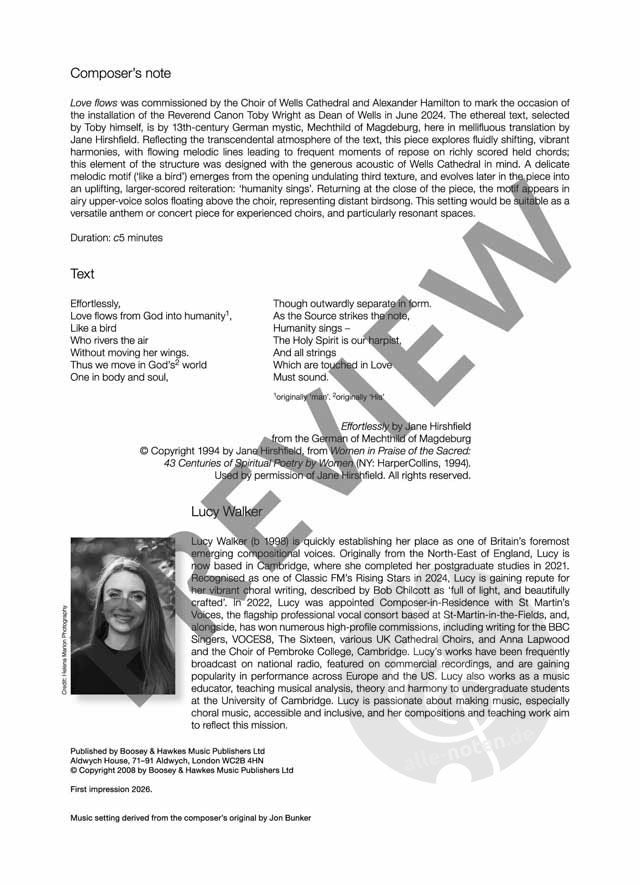 Love Flows wurde vom Chor der Kathedrale von Wells und Alexander Hamilton in Auftrag gegeben, um die Einsetzung von Reverend Canon Toby Wright als Dekan von Wells im Juni 2024 zu feiern. Der ätherische Text, der von Toby selbst ausgewählt wurde, stammt von der deutschen Mystikerin Mechthild von Magdeburg aus dem 13. Jahrhundert und ist hier in einer wohlklingenden englischen Übersetzung von Jane Hirshfield zu hören. Das Stück spiegelt die transzendentale Atmosphäre des Textes wider und erkundet flüssig wechselnde, lebendige Harmonien, mit strömenden melodischen Linien, die oft zu Momenten der Ruhe auf stimmreichen Akkorden führen. Diese Struktur wurde dabei bewußt mit einem Blick auf die großzügige Akustik der Kathedrale von Wells entworfen. Ein zartes melodisches Motiv (‘like a bird’) taucht aus der wogenden Sturktur im dritten Teil des Anfangs auf und entwickelt sich später im Stück zu einer erhebenden, größer besetzten Wiederholung: ‘humanity sings’. Am Ende des Stücks kehrt das Motiv in luftigen, über dem Chor schwebenden Oberstimmensoli wieder, die entfernten Vogelgesang darstellen. Diese Vertonung eignet sich als vielseitige Hymne oder Konzertstück für erfahrene Chöre und besonders klangvolle Räume.