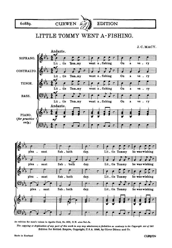 Little Tommy Went A-Fishing ispossiblyMacy's best-known work today. It is presented here for SATB choir, with a Piano reduction provided for rehearsal purposes. A version for TTBB male voice chorus is available in a separate edition.
