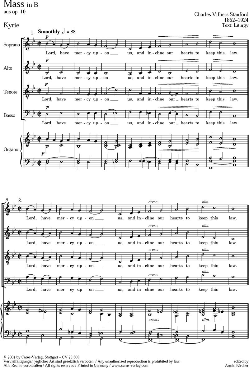 Die 'Mass' von Stanford setzt sich aus den Teilen, 'Kyrie', 'Gloria', 'Credo' und 'Sanctus' zusammen. Entnommen sind die einzelnen Sätze dem berühmten 'Morning, Communion and Evening Service in B flat'. Das Werk wurde im Jahre 1879 bei Novello gedruckt, wodurch es rasch Verbreitung fand und zum Modell für andere Komponisten wurde. Coro SATB, Org
