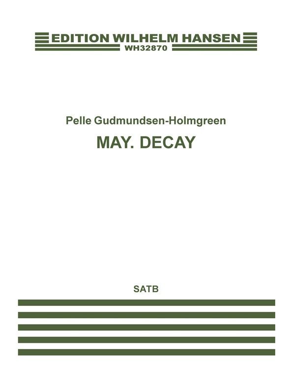 May. Decay for Mixed Choir (SATB) was composed in 2016 by Pelle Gudmundsen-Holmgreen (1932-2016). Commissioned by Danish Radio Vocal Ensemble and premiered on January 15, 2017 in Copenhagen, Denmark. MAY. DECAY is related to SORRIG. GLÆDE (WH32913). If performed together, then the sequence must be: MAY. DECAY & SORRIG. GLÆDE