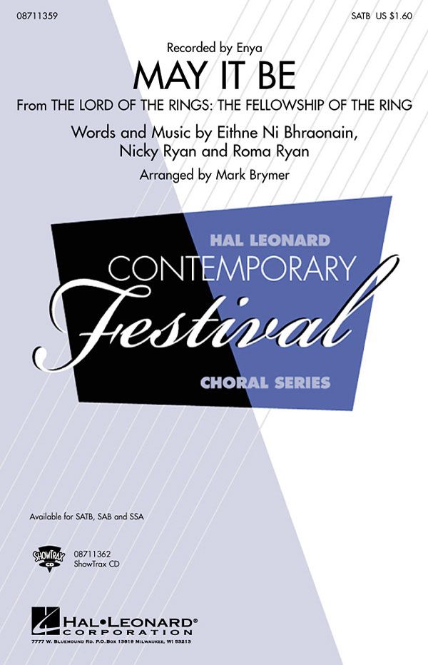 All die Geheimnisse und die Magie von Mittelerde werden in diesem von Enya gesungenen Lied in Der Herr der Ringe lebendig: Die Gefährten des Rings. Das sanfte Arrangement im keltischen Stil ist atemberaubend!separat erhältlich: SATB, SAB, SSA und ShowTrax CD. Aufführungsdauer: ca. 4:10.
