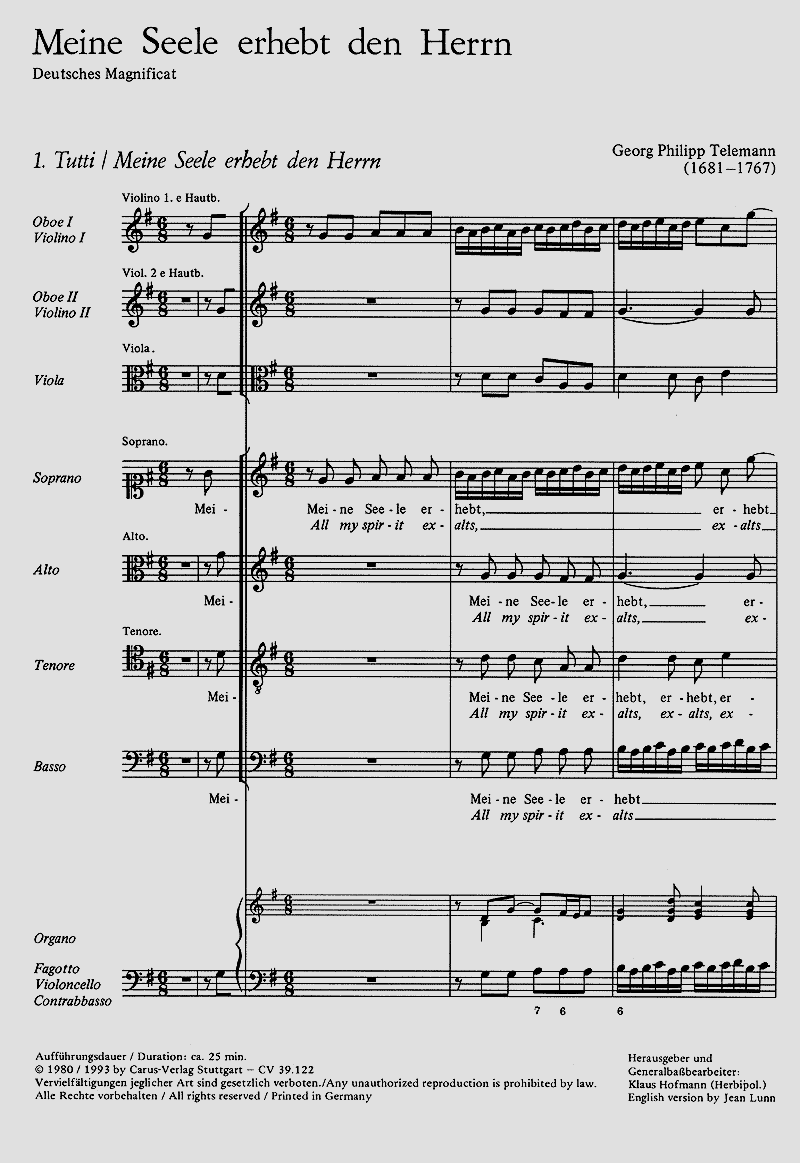 Deutsches Magnificat - Georg Philipp Telemanns 'Deutsches Magnificat' erscheint hier zum ersten Mal im Druck. Die Ausgabe gibt den Notentext der Berliner Partiturhandschrift in einer der heutigen Editions- und Aufführungspraxis entsprechenden Umschrift wieder. Soli SATB, Coro SATB, 2 Ob, 2 Blfl f1, 2 Vl, Va, Bc