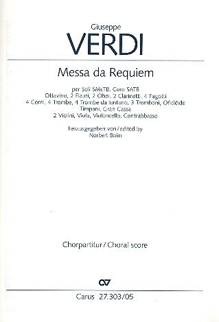 Unter den zahlreichen Kompositionen Verdis bleibt das Requiem als kirchenmusikalisches Werk singulär. Es ist als musikalisches Memorial für den von Verdi tief verehrten italienischen Nationaldichter Alessandro Manzoni entstanden und wurde zu dessen erstem Todestag am 22. Mai 1874 im Mailänder Dom uraufgeführt. Das Ausloten vieler Extreme stellt Verdis Musiksprache ganz in den Dienst einer mit musikalischen Mitteln dramatisierten Liturgie. In ihrem Stichbild trägt die Neuausgabe der Partitur dem umfangreichen Instrumental- und Vokalensemble Rechnung. Sie stellt eine auf dem Autograph als der wesentlichen Quelle basierende wissenschaftlich-kritische Ausgabe einer der bedeutendsten Requiem-Vertonungen des 19. Jahrhunderts dar. Die Partitur enthält neben dem Notentext ein ausführliches Vorwort in drei Sprachen, einen Kritischen Bericht mit Informationen zur Quellenlage, Edition und Lesarten.