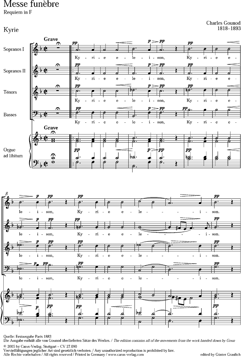 Requiem in F - Edition nach der Erstausgabe Paris 1883. Die Ausgabe enthält alle von Gounod überlieferten Sätze des Werkes (Kyrie, Sanctus, Pie Jesu, Agnus Dei).