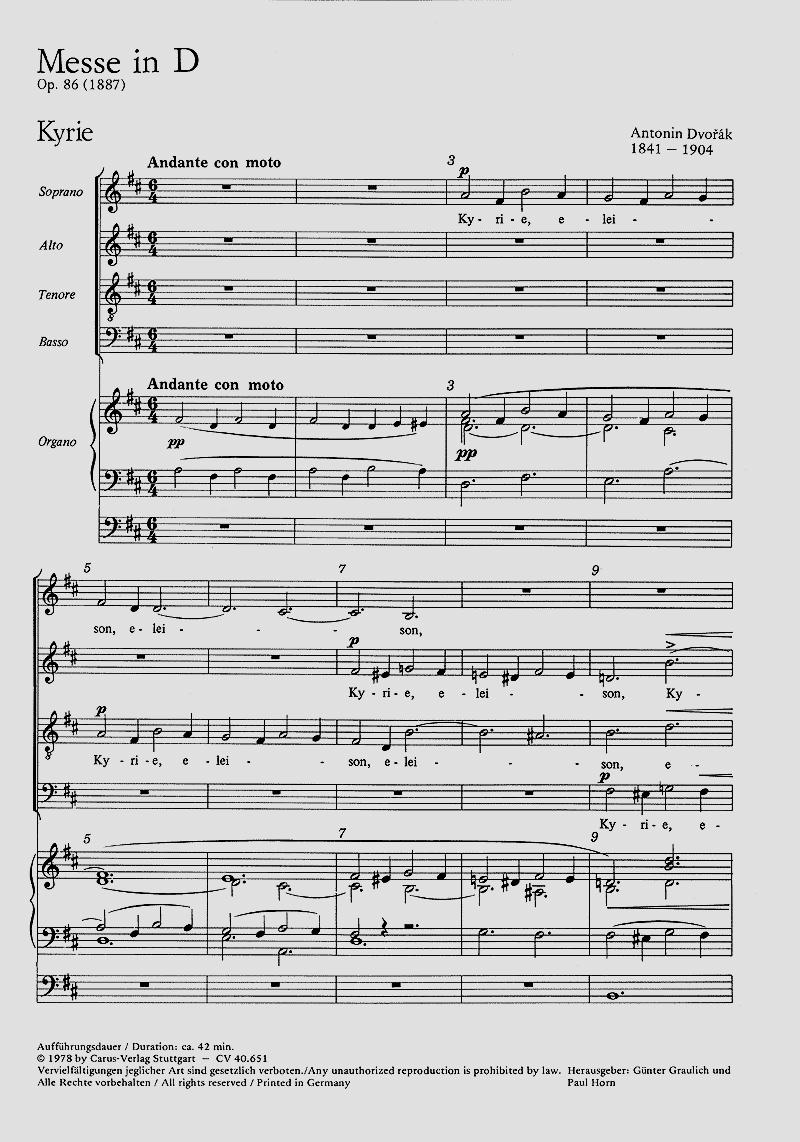 Neben dem Te Deum und dem Stabat Mater zählt Dvoráks D-Dur-Messe op. 86 zu den herausragenden Werken seines geistlichen Schaffens. Sie liegt als Orgel und Orchesterfassung vor. Seit ihrer Uraufführung 1893 im Londoner Crystal Palace hat sich die orchestrierte Version weltweit eine kontinuierliche Aufführungstradition geschaffen. Die Gründe für diesen Erfolg liegen im nur mittleren Schwierigkeitsgrad, in der Nähe zum klassisch-romantischen Stil (besonders zu Schubert), in der Vermeidung dramatischer Effekte sowie nicht zuletzt in jenem dezent folkloristischen Tonfall, der Dvoráks Werken generell eine konstante Beliebtheit sichert. Orchesterfassung: Soli SATB, Coro SATB, 2 Ob, 2 Fg, 3 Cor, 2 Tr, 3 Trb, Timp, 2 Vl, Va, Vc, Cb, Org; Orgelfassung: Soli SATB, Coro SATB, Org