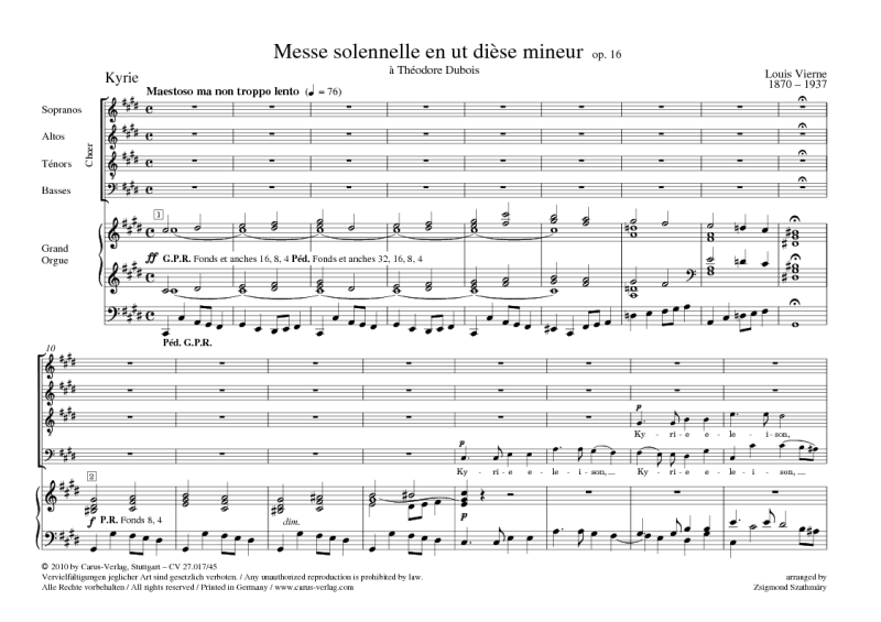 Die vorliegende Edition stützt sich auf den Erstdruck, der 1900 bei Pérégally & Fils in Paris erschien. Aus praktischen Erwägungen - vielfach ist eine Aufführung mit zwei Orgeln nicht möglich - legt der Verlag parallel zur Originalausgabe (ed. Jon Laukvik) eine Bearbeitung für Chor und eine Orgel von Zsigmond Szathmáry vor.