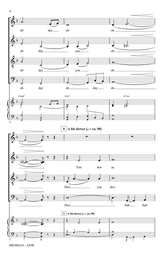 From 1965, this classic by the Beatles showcases the purity of a cappella voices highlighting the beauty and longing of this expressive song. The opening and closing are largely homophonic, with a quasi-Baroque middle section adding interest. Harmonic freshness and occasional rhythmic extensions of the lyric highlight the text in a way that enhances the poetry. For pop, jazz and concert choirs.