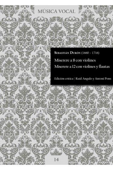 This volume contains the two Misereres composed by Sebastián Durón, chapel master of the Royal Chapel in Madrid. Both Misereres are preserved in the archive of the the Royal Monastery of San Lorenzo de El Escorial. They are written for several choirs of voices and instruments. When Durón was exiled to France, he asked to be sent many of his works composed during his stay in Madrid. For this reason, the preserved works for large ensembles by Durón are very rare.