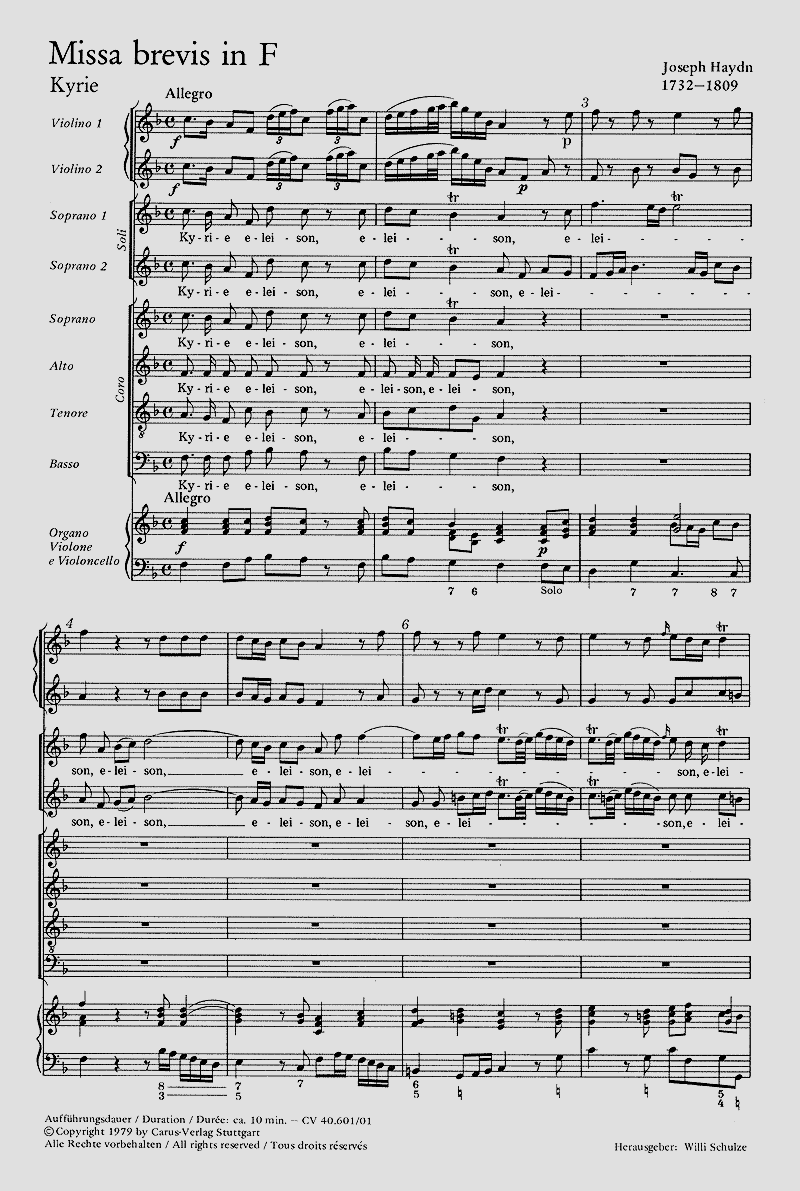 Haydns erste Messe zeigt bei aller volkstümlichen Melodik einen andächtigen Wesenszug, der, ebenso wie ihr jugendlicher Schwung, noch den alten Haydn begeisterte, der 1805 sein Erstlingswerk neu instrumentierte. Als Entstehungszeit der Erstfassung gelten die Jahre 1749 oder 1750. Um die gleiche Zeit befasste sich Papst Benedikt XIV. in seiner Enzyklika 'Annus qui' mit Fragen der Kirchenmusik. Er verurteilt darin ihren oftmals opernhaften Stil und fordert eine liturgische Musik, die sich ihrer religiösen Aufgabe bewusst ist und si mit einfachen musikalischen Ausdrucksmitteln zu erfüllen sucht. Haydns erste Messe steht in ihrer liturgischen Haltung auf dem Boden dieser Anschauung, die weithgend der allgemeinen kirchlichen Auffassung des 18. Jahrhunderts entsprach. Soli SS, Coro SATB, 2 Vl, Vc/Cb, Org