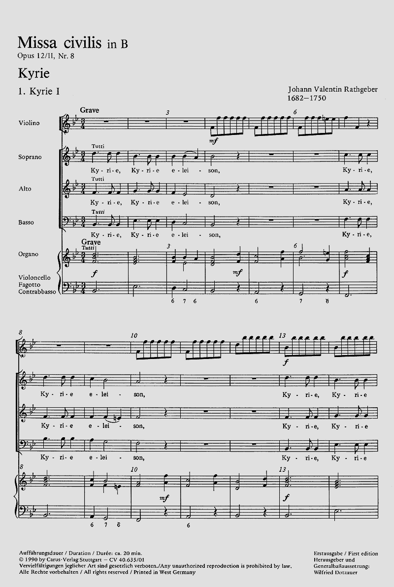 Zur leichteren Aufführbarkeit verzichtete Rathgeber auf Bläser und reduzierte das übliche Kirchentrio auf Orgel mit Violino unisono. Der Orgelbass kann durch Violoncello (und/oder Kontrabass) ergänzt werden, da ihre Stimmen identisch sind. Soli SAB, Coro SAB, Vl, Bc