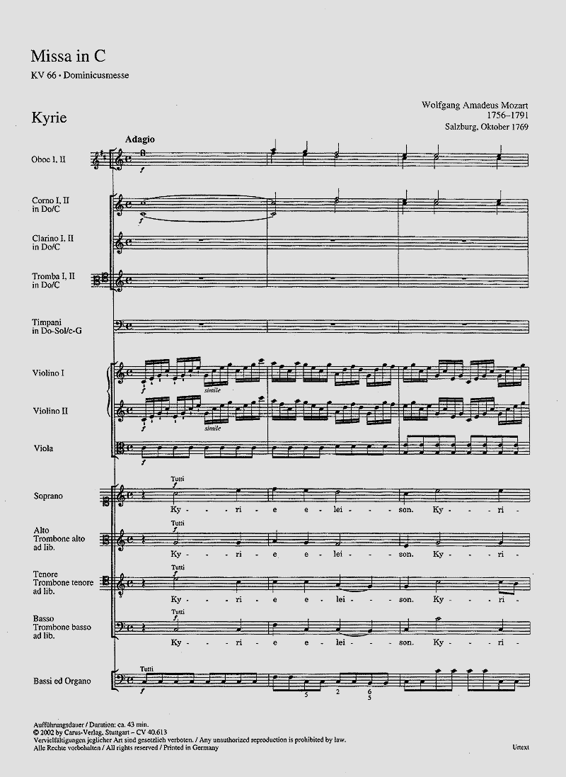 Dominicusmesse - Mozarts 'Dominikusmesse' wurde zur Primiz Cajetan Hagenauers, des späteren Paters Dominicus, 1769 in Salzburg geschrieben. Dem Typus nach handelt es sich um eine 'feierliche Messe' mit großer, auch Blechbläser heranziehende Besetzung, wie man sie zu kirchlichen Hochfesten und anderen besonders repräsentativen geistlichen Anlässen zelebrierte. Mozart betont diesen solemnen Charakter noch durch eine langsame Einleitung zu Anfang des Kyrie und zwei ausführliche Fugen am Ende von Gloria und Credo. Obwohl Mozart das Werk bereits mit 13 Jahren schrieb, übertrifft es schon einen Großteil der durchschnittlichen kirchlichen Gebrauchsmusik seiner Zeit. Soli SATB, Coro SATB, 2 Fl, 2 Ob, 2 Cor, 2 Ctr, 2 Tr, Timp, 2 Vl, 2 Va, Bc, [3 Trb]