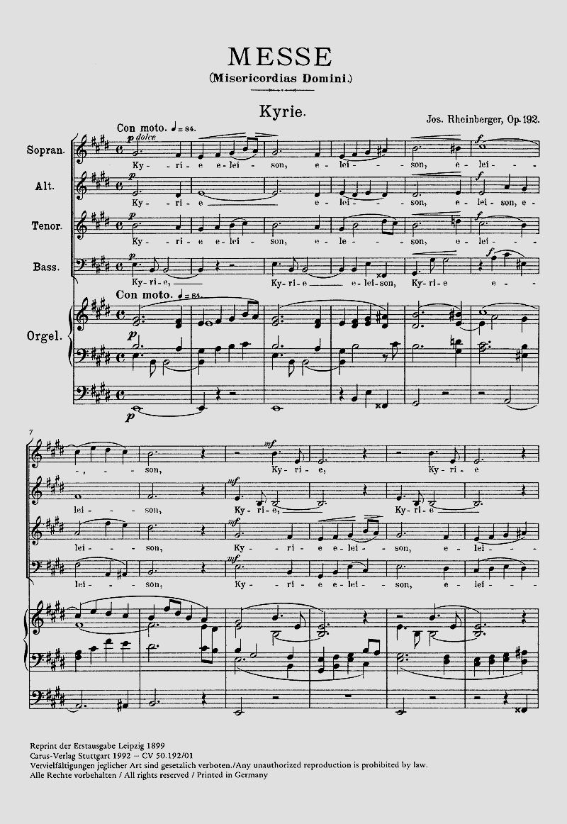 Misericordias Domini - Wohl auf eine Bitte des Verlegers Otto Forberg begann Rheinberger mit der Komposition dieser Messe. Der Beiname 'Misericordias Domini', den die Messe in der Druckausgabe und vielleicht schon im verschollenen Autograph führt, wird in den Skizzen nicht genannt; auch liegen keine Anhaltspunkte vor, dass ein besonderes Ereignis den Komponisten zur Wahl dieses Titels veranlasst hätte. Der Appell an das göttliche Erbarmen mag sich schlicht aus seiner Lebenssituation erklären. Coro SATB, Org, [Soli SATB]