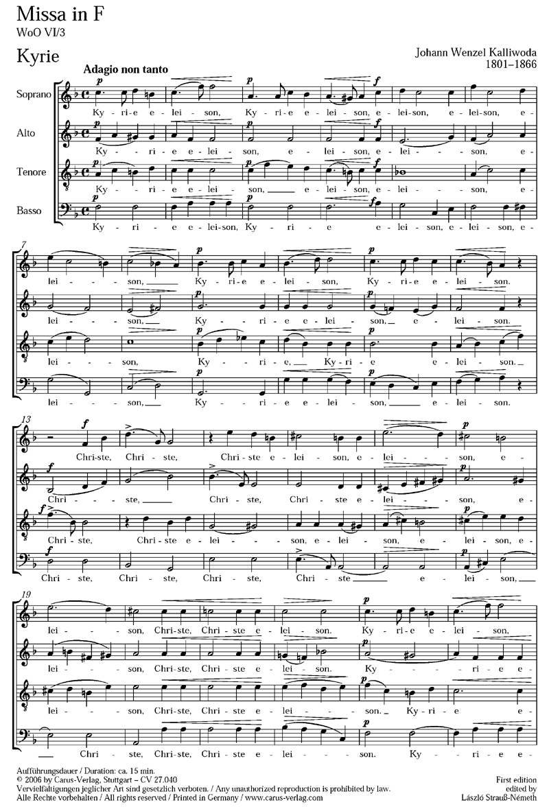 Kalliwodas Messe ist ein Beispiel für die höfische Musikpflege im 19. Jahrhundert, die immer stärker zu den Randerscheinungen des kulturellen Lebens wurde. In der Messe verzichtet Kalliwoda nahezu auf polyphone Stimmführung - lediglich das 'Et vitam venturi saeculi' wird in zwei jeweils paarweise verstärktn Stimmen kanonisch eingeführt - und widmet sich stattdessen verstärkt der harmonischen Ausarbeitung. - Coro SATB