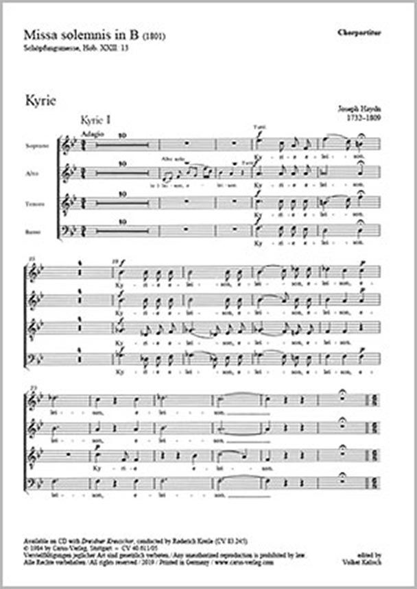 Schöpfungsmesse - Innerhalb von ca. sechs Wochen hat Haydn die Schöpungsmesse im Jahre 1801 als fünfte der insgesamt sechs späten Missae solemnes im Auftrag seines Dienstherrn Fürst Nikolaus II. Esterházy komponiert. Der Beiname 'Schöpfungsmesse' ist zwar nicht authentisch, gründet sich wohl aber auf das Zitat im 'Gloria' aus dem Oratorium 'Die Schöpfung'. Soli SATB, Coro SATB, 2 Ob, 2 Clt, 2 Fg, 2 Cor, 2 Tr, Timp, 2 Vl, Va, Vc/Cb, Org