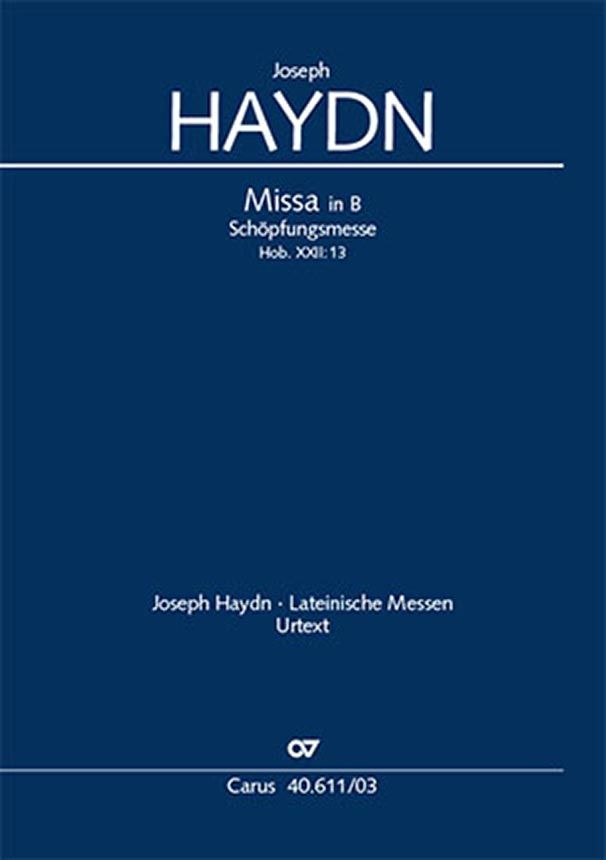Schöpfungsmesse - Innerhalb von ca. sechs Wochen hat Haydn die Schöpungsmesse im Jahre 1801 als fünfte der insgesamt sechs späten Missae solemnes im Auftrag seines Dienstherrn Fürst Nikolaus II. Esterházy komponiert. Der Beiname 'Schöpfungsmesse' ist zwar nicht authentisch, gründet sich wohl aber auf das Zitat im 'Gloria' aus dem Oratorium 'Die Schöpfung'. Soli SATB, Coro SATB, 2 Ob, 2 Clt, 2 Fg, 2 Cor, 2 Tr, Timp, 2 Vl, Va, Vc/Cb, Org