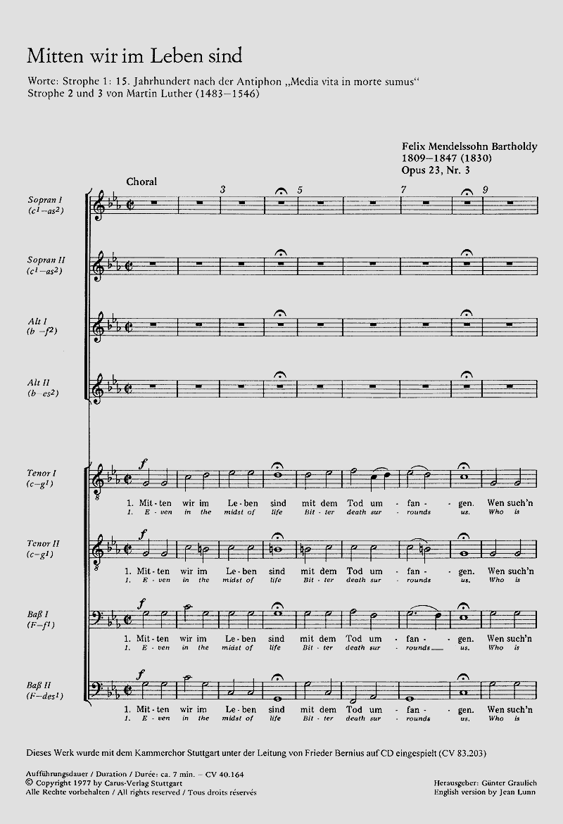 Der Choral 'Mitten wir im Leben sind' ist 'wohl eins der besten Kirchenstücke, die ich gemacht habe, und brummt bös, oder er pfeift dunkelblau' schreibt Mendelssohn an seine Schwester Fanny am 22.11.1830. - Coro SSAATTBB