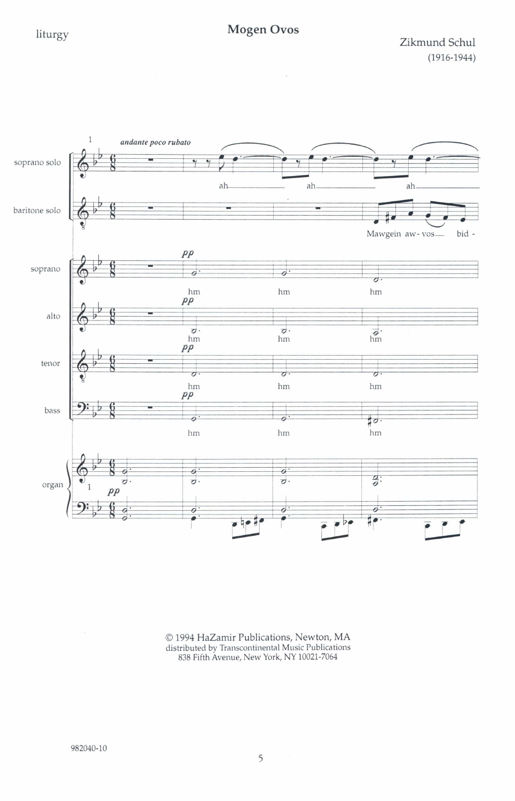 Schul was a German-Jewish composer who came to Prague, seeking a haven from Nazi persecution. But in 1941 he was rounded up and sent to the Terezin concentration camp, where his touching setting of the Sabbath evening prayer was sung. Useful for Holocaust programs which reference composers who died during the Holocaust. Available for SATB with solo and organ.